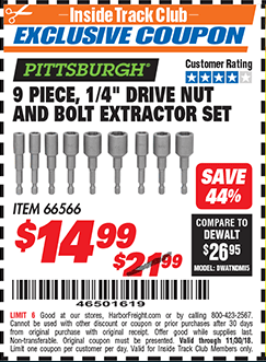 ITC 9 PIECE, 1/4" DRIVE NUT AND BOLT EXTRACTOR SET Lot No. 66566 Expired: 11/30/18 - $14.99 Coupon Code: '46501619'