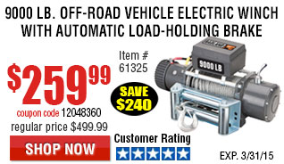 9000 LB. ELECTRIC WINCH WITH REMOTE CONTROL AND AUTOMATIC BRAKE Lot No. 61346/61325/62596/62278/68143 Expired: 9/22/15 - $259.99 Coupon Code: '11884215'