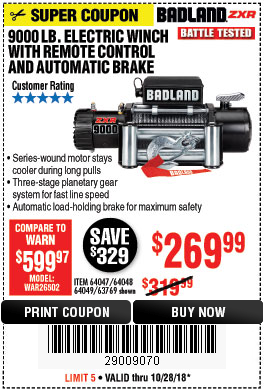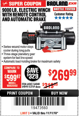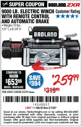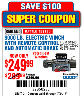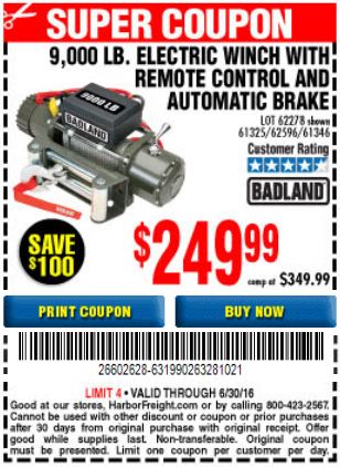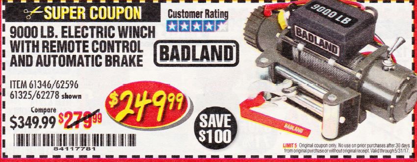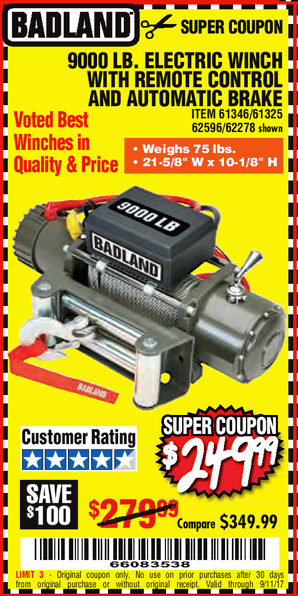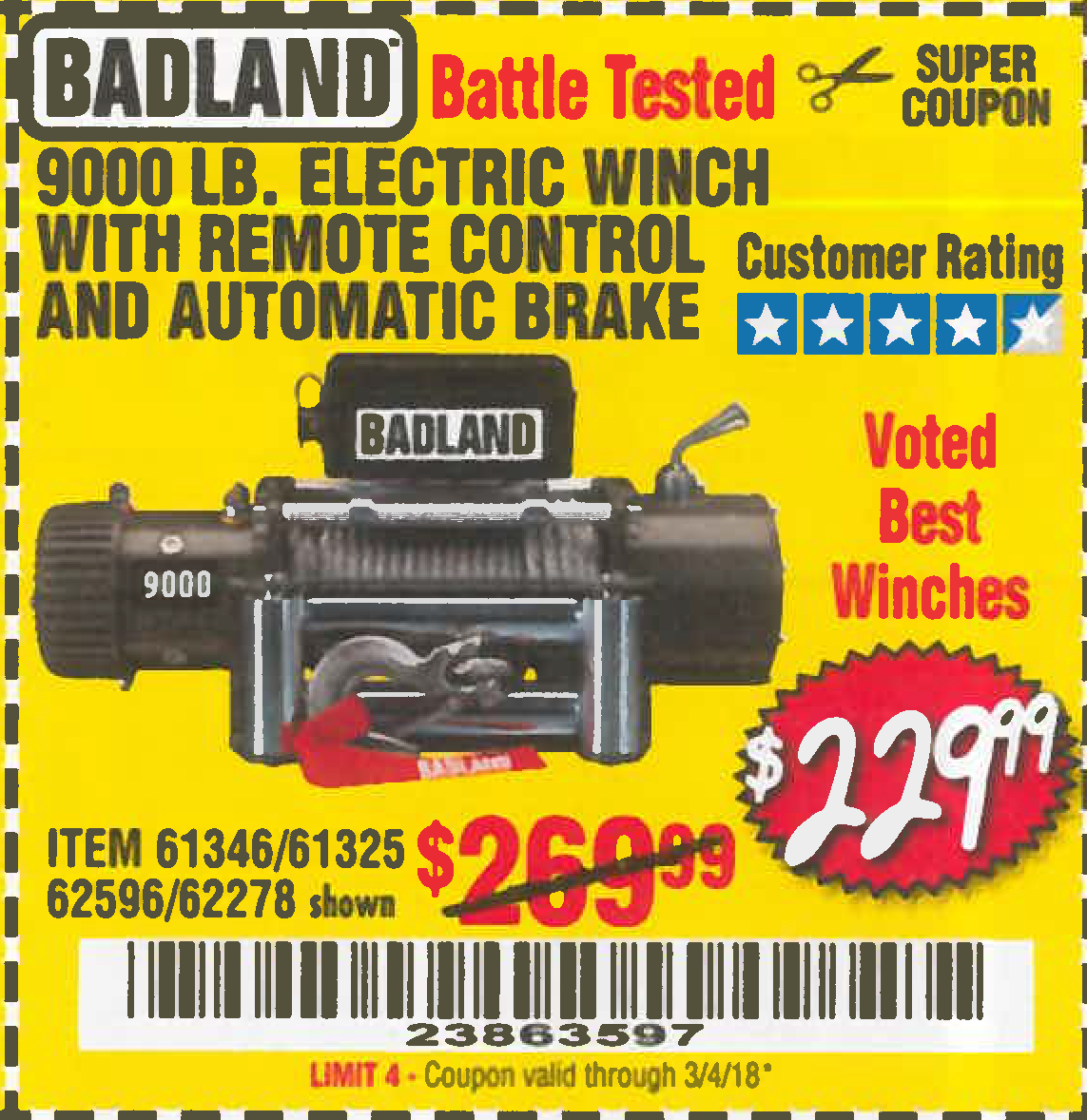 9000 LB. ELECTRIC WINCH WITH REMOTE CONTROL AND AUTOMATIC BRAKE Lot No. 61346/61325/62596/62278/68143 Expired: 2/10/18 - $229.99 Coupon Code: '44630485'