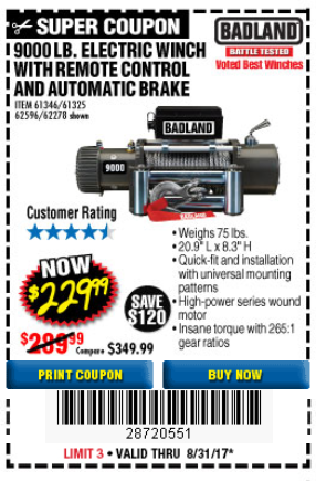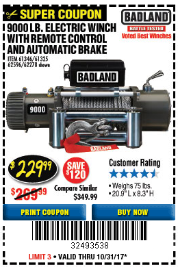 9000 LB. ELECTRIC WINCH WITH REMOTE CONTROL AND AUTOMATIC BRAKE Lot No. 61346/61325/62596/62278/68143 Expired: 10/31/17 - $229.99 Coupon Code: '32493538'