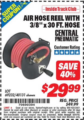 ITC AIR HOSE REEL WITH 3/8" x 30 FT. HOSE Lot No. 69232/40131 Expired: 3/31/15 - $29.99 Coupon Code: '70690394'