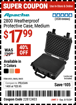 APACHE 2800 WEATHERPROOF PROTECTIVE CASE, MEDIUM, ORANGE Lot No. 58655/64551/58656 Expired: 12/31/69 - $19.99 Coupon Code: 'n/a'