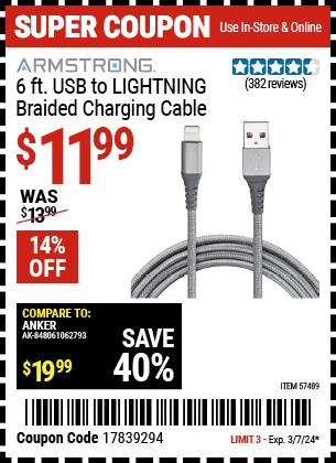 ARMSTRONG 6 FT. USB TO LIGHTNING BRAIDED CHARGING CABLE Lot No. 57489 Expired: 1/26/25 - $10.99 Coupon Code: '58575443'
