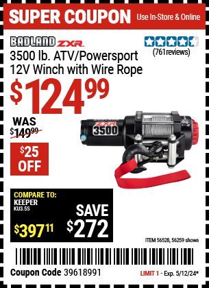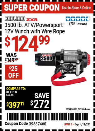 BADLAND ZXR 3500 LB. UTV/POWERSPORT WINCH WITH AUTOMATIC LOAD-HOLDING BRAKE Lot No. 56259 Expired: 4/11/24 - $124.99 Coupon Code: '39587460'