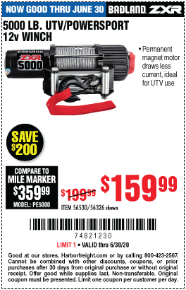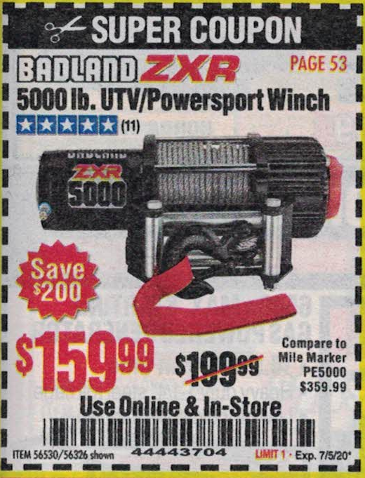 BADLAND ZXR 5000 LB. UTV/POWERSPORT WINCH WITH AUTOMATIC LOAD-HOLDING BRAKE Lot No. 56326/56530 Expired: 6/30/20 - $159.99 Coupon Code: '74821230'