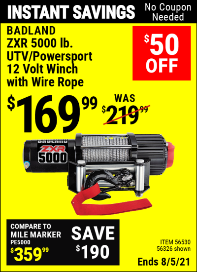 BADLAND ZXR 5000 LB. UTV/POWERSPORT WINCH WITH AUTOMATIC LOAD-HOLDING BRAKE Lot No. 56326/56530 Expired: 8/5/21 - $169.99 Coupon Code: 'n/a'