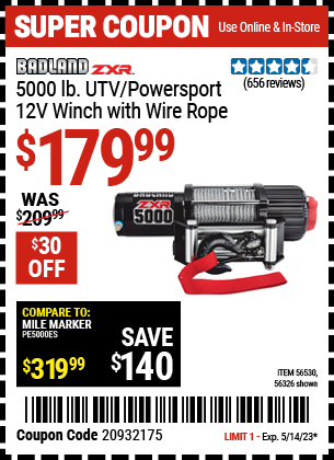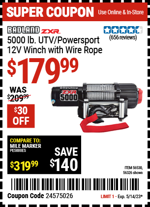 BADLAND ZXR 5000 LB. UTV/POWERSPORT WINCH WITH AUTOMATIC LOAD-HOLDING BRAKE Lot No. 56326/56530 Expired: 5/14/23 - $179.99 Coupon Code: '24575026'