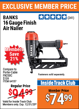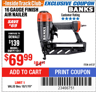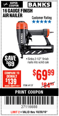 BANKS 16 GAUGE FINISH AIR NAILER Lot No. 64137 Expired: 10/20/19 - $69.99 Coupon Code: '27116688'
