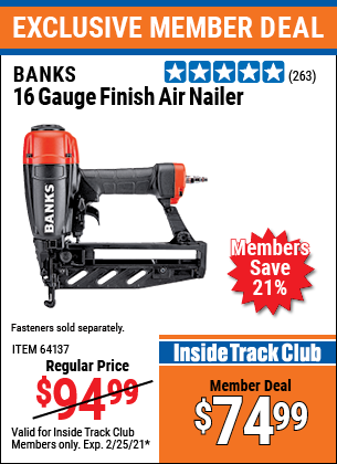 BANKS 16 GAUGE FINISH AIR NAILER Lot No. 64137 Expired: 7/1/21 - $74.99 Coupon Code: '15250701'