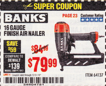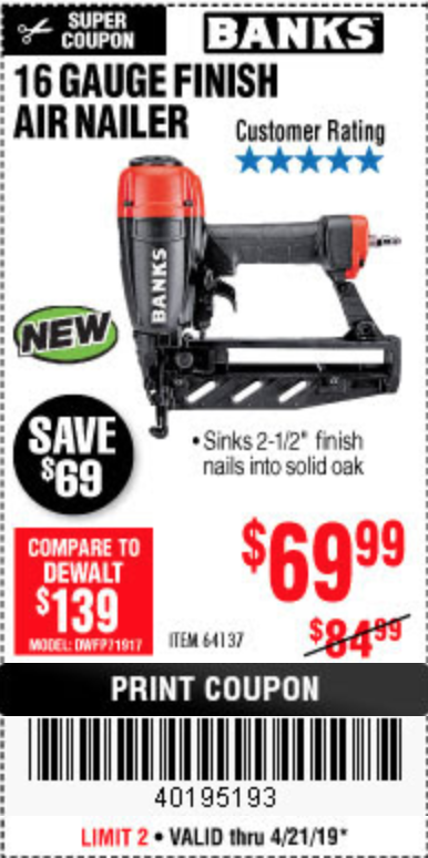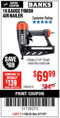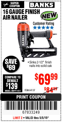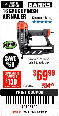 BANKS 16 GAUGE FINISH AIR NAILER Lot No. 64137 Expired: 4/21/19 - $69.99 Coupon Code: '40195193'