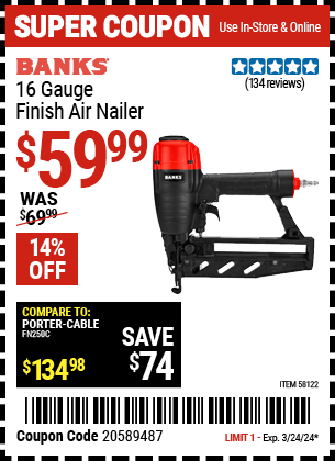 BANKS 16 GAUGE FINISH AIR NAILER Lot No. 64137 Expired: 3/24/24 - $59.99 Coupon Code: '20589487'