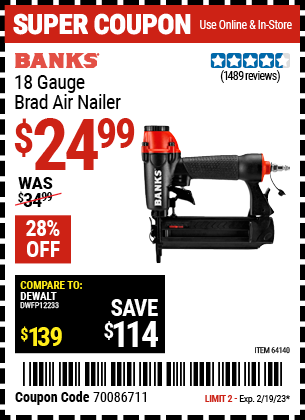 BANKS 18 GAUGE BRAD AIR NAILER Lot No. 64140 Expired: 2/19/23 - $24.99 Coupon Code: '70086711'