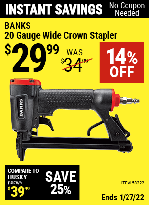 BANKS 20 GAUGE, 7/16 IN. WIDE CROWN STAPLER Lot No. 58222 Expired: 1/27/22 - $29.99 Coupon Code: 'n/a'