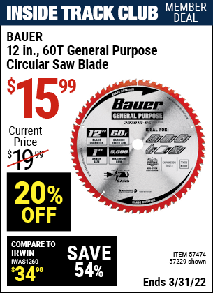 ITC BAUER 12IN 60T GENERAL PURPOSE CIRCULAR SAW BLADE Lot No. 57474 Expired: 3/31/22 - $15.99 Coupon Code: 'n/a'