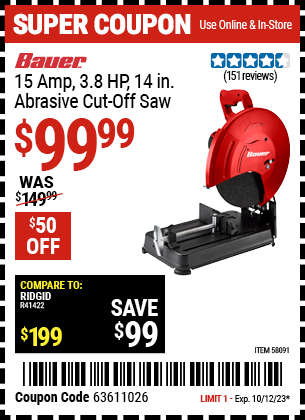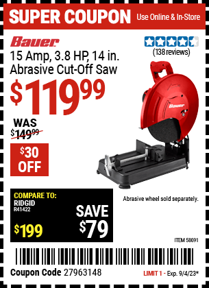 BAUER 15 AMP, 3.8 HP, 14 IN. ABRASIVE CUT-OFF SAW Lot No. 58091 Expired: 9/4/23 - $119.99 Coupon Code: '27963148'
