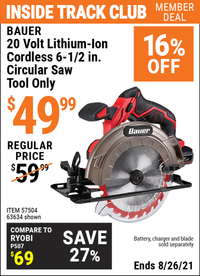 ITC BAUER 20V 6-12" CIRCULAR SAW Lot No. 63634 Expired: 8/26/21 - $49.99 Coupon Code: 'n/a'