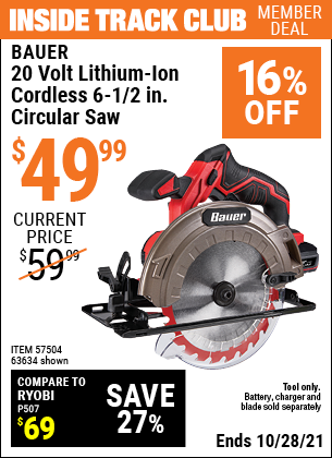 ITC BAUER 20V 6-12" CIRCULAR SAW Lot No. 63634 Expired: 10/28/21 - $49.99 Coupon Code: 'n/a'