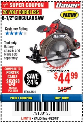 BAUER 20V 6-12" CIRCULAR SAW Lot No. 63634 Expired: 4/22/18 - $44.99 Coupon Code: '79100135'
