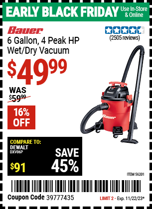 BAUER 6 GALLON, 4 PEAK HP WET/DRY VACUUM Lot No. 56201 Expired: 11/23/22 - $49.99 Coupon Code: '67804149'