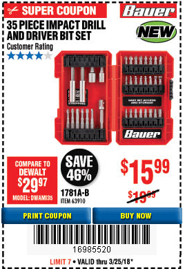 BAUER IMPACT DRILL AND DRIVER BIT SET, 35-PIECE Lot No. 63910 Expired: 3/25/18 - $15.99 Coupon Code: '16985520'