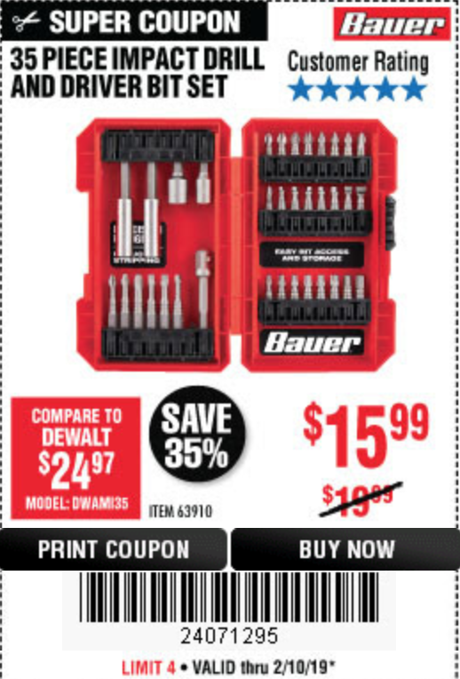 BAUER IMPACT DRILL AND DRIVER BIT SET, 35-PIECE Lot No. 63910 Expired: 2/10/19 - $15.99 Coupon Code: '24071295'