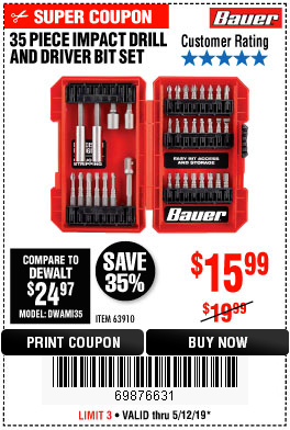 BAUER IMPACT DRILL AND DRIVER BIT SET, 35-PIECE Lot No. 63910 Expired: 5/12/19 - $15.99 Coupon Code: '69876631'