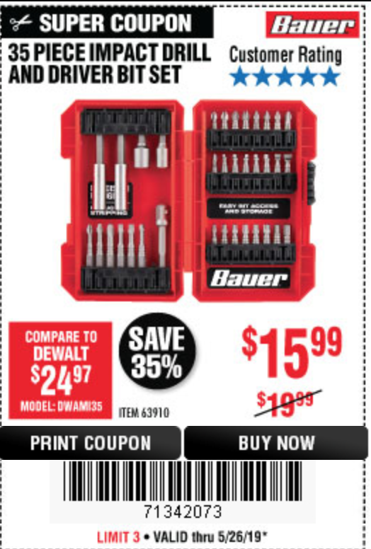 BAUER IMPACT DRILL AND DRIVER BIT SET, 35-PIECE Lot No. 63910 Expired: 5/26/19 - $15.99 Coupon Code: '71342073'