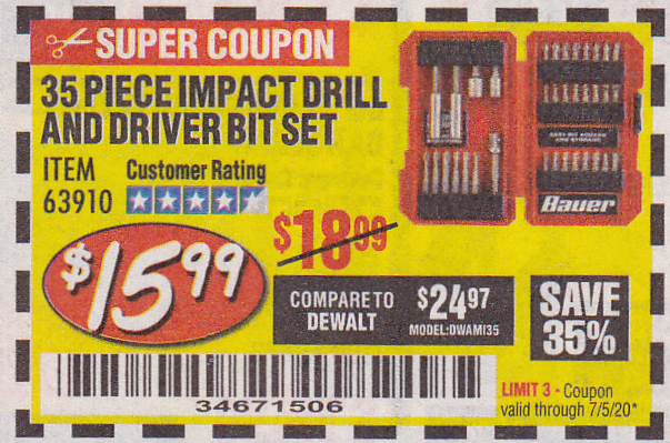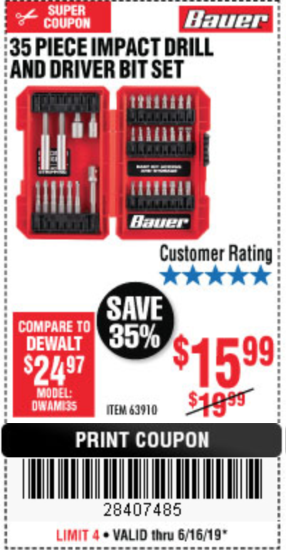 BAUER IMPACT DRILL AND DRIVER BIT SET, 35-PIECE Lot No. 63910 Expired: 6/30/20 - $15.99 Coupon Code: '52308543'
