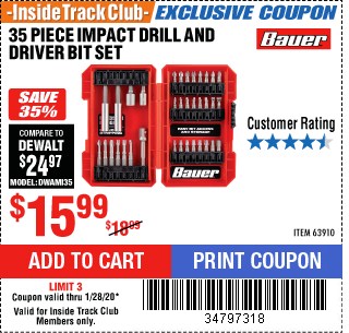 BAUER IMPACT DRILL AND DRIVER BIT SET, 35-PIECE Lot No. 63910 Expired: 1/28/20 - $15.99 Coupon Code: '34797318'