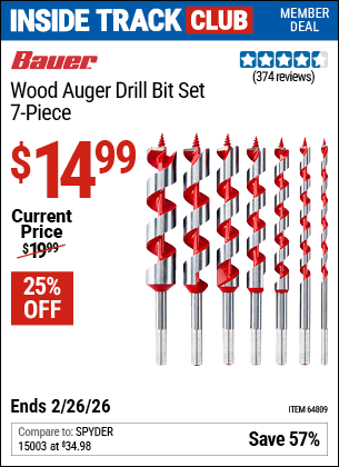 ITC BAUER WOOD AUGER DRILL BIT SET, 7-PIECE Lot No. 64809 Valid Thru: 2/26/26 - $14.99 Coupon Code: 'n/a' (current price - 20% = 0) add to list