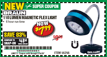 BRAUN 110 LUMEN FLEXIBLE LED WORK LIGHT Lot No. 56256 Expired: 3/14/20 - $7.99 Coupon Code: '18086995'