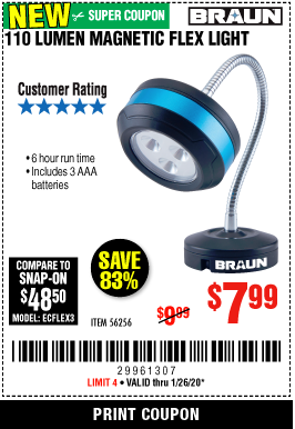 BRAUN 110 LUMEN FLEXIBLE LED WORK LIGHT Lot No. 56256 Expired: 1/26/20 - $7.99 Coupon Code: '29961307'