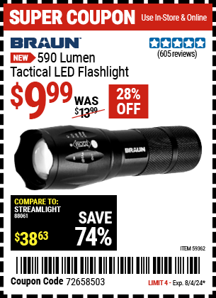 BRAUN 590 LUMEN TACTICAL LED FLASHLIGHT Lot No. 59362 Expired: 8/4/24 - $9.99 Coupon Code: '72658503'