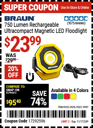 BRAUN 750 LUMEN RECHARGEABLE ULTRACOMPACT MAGNETIC LED FLOODLIGHT Lot No. 59225/59226/59227/59587 Expired: 11/17/24 - $23.99 Coupon Code: '17292596'