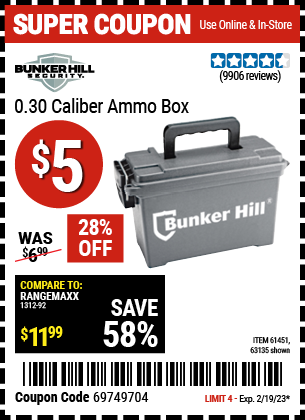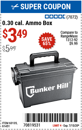 BUNKER HILL 0.30 CAL. AMMO BOX Lot No. 63135/61451 Expired: 7/4/23 - $3.99 Coupon Code: '74139913'