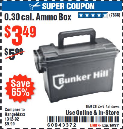BUNKER HILL 0.30 CAL. AMMO BOX Lot No. 63135/61451 Expired: 1/8/21 - $3.49 Coupon Code: '60943372'