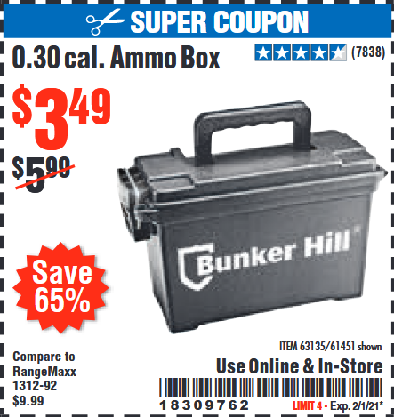 BUNKER HILL 0.30 CAL. AMMO BOX Lot No. 63135/61451 Expired: 2/1/21 - $3.49 Coupon Code: '18309762'