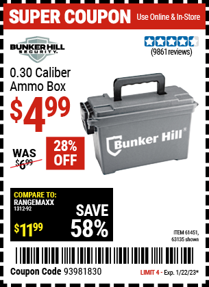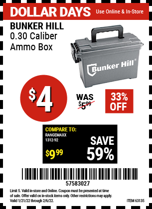 BUNKER HILL 0.30 CAL. AMMO BOX Lot No. 63135/61451 Expired: 1/22/23 - $4.99 Coupon Code: '93981830'