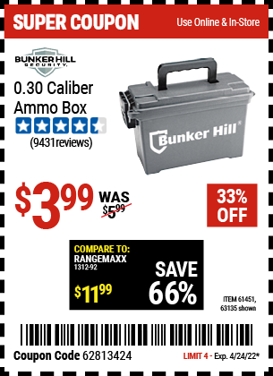 BUNKER HILL 0.30 CAL. AMMO BOX Lot No. 63135/61451 Expired: 4/24/22 - $3.99 Coupon Code: '62813424'