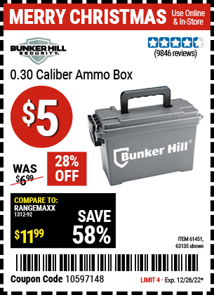 BUNKER HILL 0.30 CAL. AMMO BOX Lot No. 63135/61451 Expired: 10/13/22 - $3.99 Coupon Code: '17282072'
