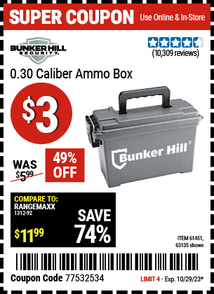 BUNKER HILL 0.30 CAL. AMMO BOX Lot No. 63135/61451 Expired: 10/9/22 - $4.99 Coupon Code: '25735692'