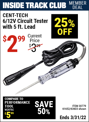 ITC CEN-TECH 6/12V CIRCUIT TESTER WITH 5 FT. LEAD Lot No. 63603/61652 Expired: 3/31/22 - $2.99 Coupon Code: 'n/a'