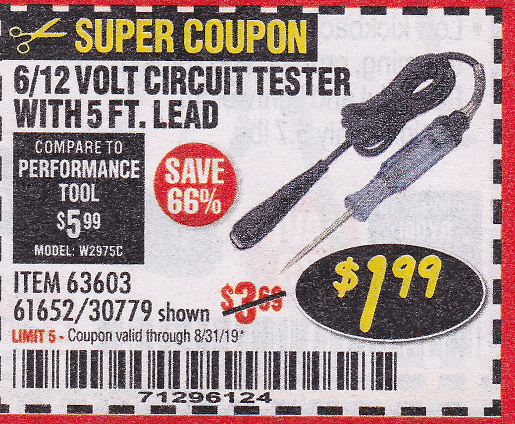 CEN-TECH 6/12V CIRCUIT TESTER WITH 5 FT. LEAD Lot No. 63603/61652 Expired: 8/31/19 - $1.99 Coupon Code: '71296124'