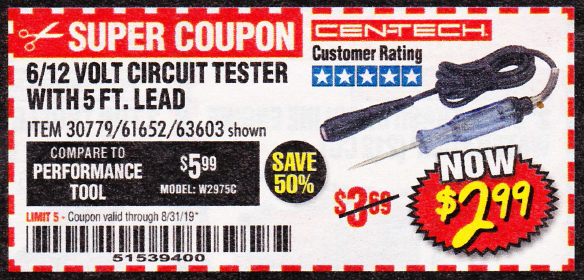 CEN-TECH 6/12V CIRCUIT TESTER WITH 5 FT. LEAD Lot No. 63603/61652 Expired: 8/31/19 - $2.99 Coupon Code: '51539400'