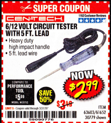 CEN-TECH 6/12V CIRCUIT TESTER WITH 5 FT. LEAD Lot No. 63603/61652 Expired: 3/31/20 - $2.99 Coupon Code: '59090776'