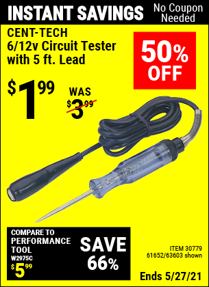 CEN-TECH 6/12V CIRCUIT TESTER WITH 5 FT. LEAD Lot No. 63603/61652 Expired: 4/29/21 - $1.99 Coupon Code: 'n/a'