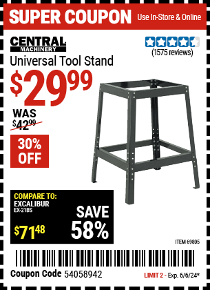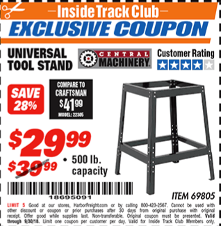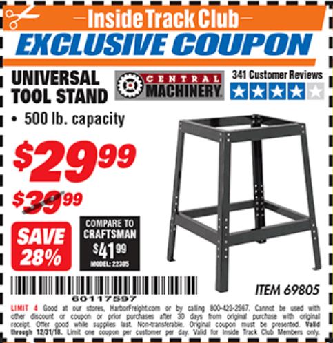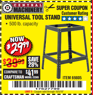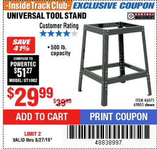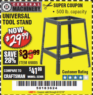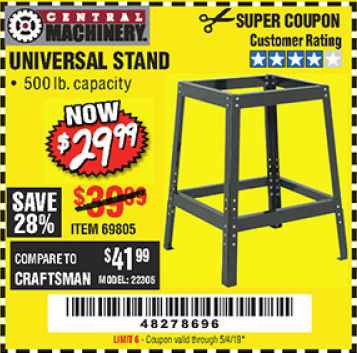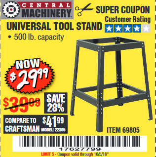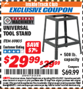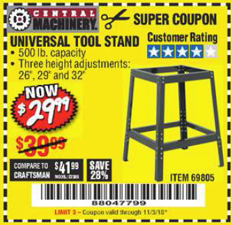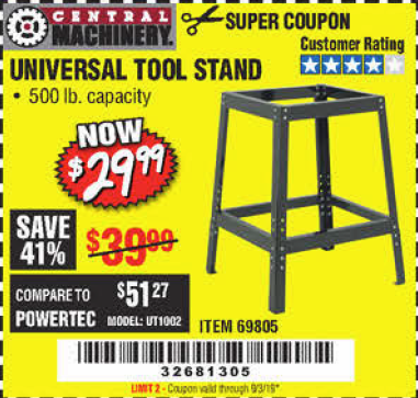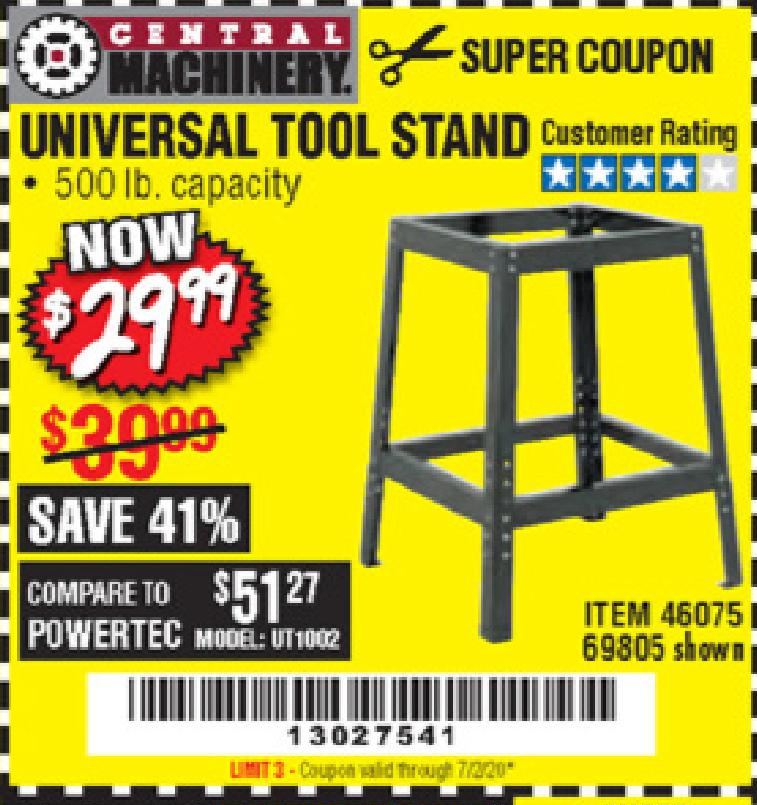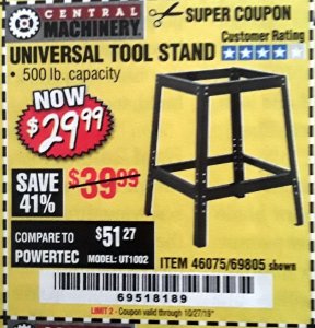 ITC CENTRAL MACHINERY UNIVERSAL TOOL STAND Lot No. 69805 Valid Thru: 10/30/25 - $34.99 Coupon Code: 'n/a' (current price - 10% = 0) add to list