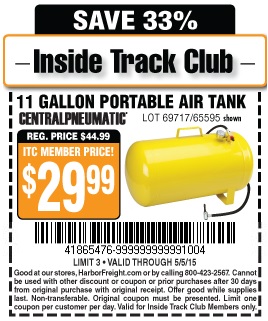 ITC CENTRAL PNEUMATIC 11 GALLON PORTABLE AIR TANK Lot No. 65595/69717/63606 Expired: 5/5/15 - $29.99 Coupon Code: '41865476'