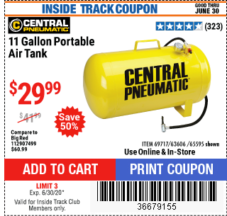 ITC CENTRAL PNEUMATIC 11 GALLON PORTABLE AIR TANK Lot No. 65595/69717/63606 Expired: 6/30/20 - $29.99 Coupon Code: '38844572'