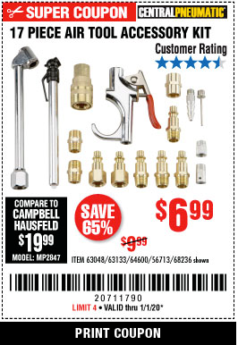 CENTRAL PNEUMATIC 17 PIECE AIR TOOL ACCESSORY KIT Lot No. 63048/63133/64600/56713/68236 Expired: 1/1/20 - $6.99 Coupon Code: '20711790'